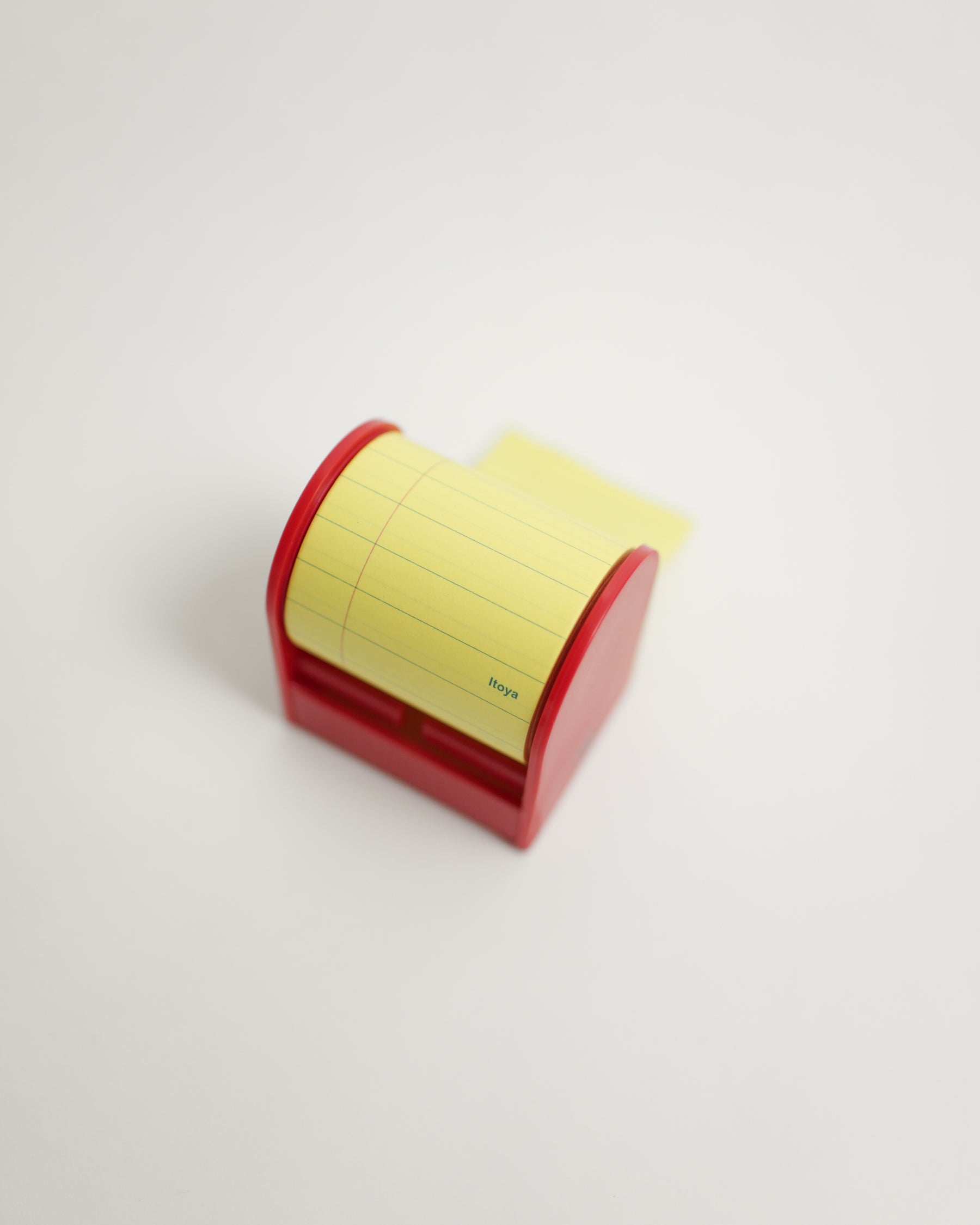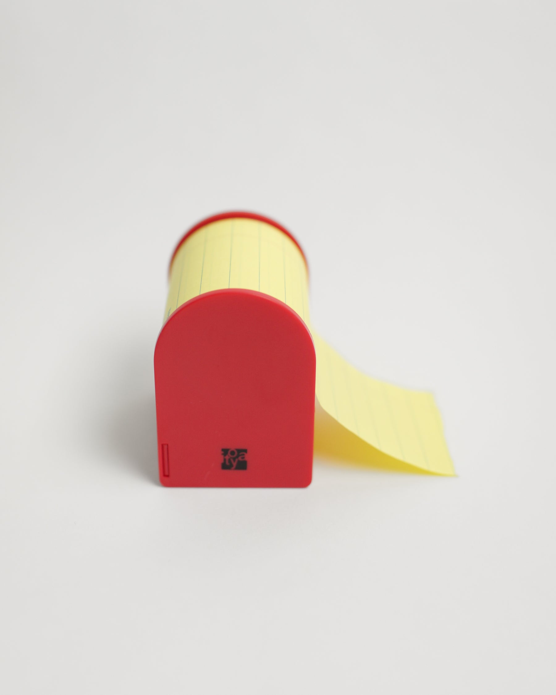 A roll of yellow lined sticky paper, contained in a red dispenser. Notes can be cut to any length using the dispenser’s two cutting options — straight or jagged. The adhesive backing lets you stick and reposition your notes repeatedly, while the vertical lines make writing to-do lists simple and neat.