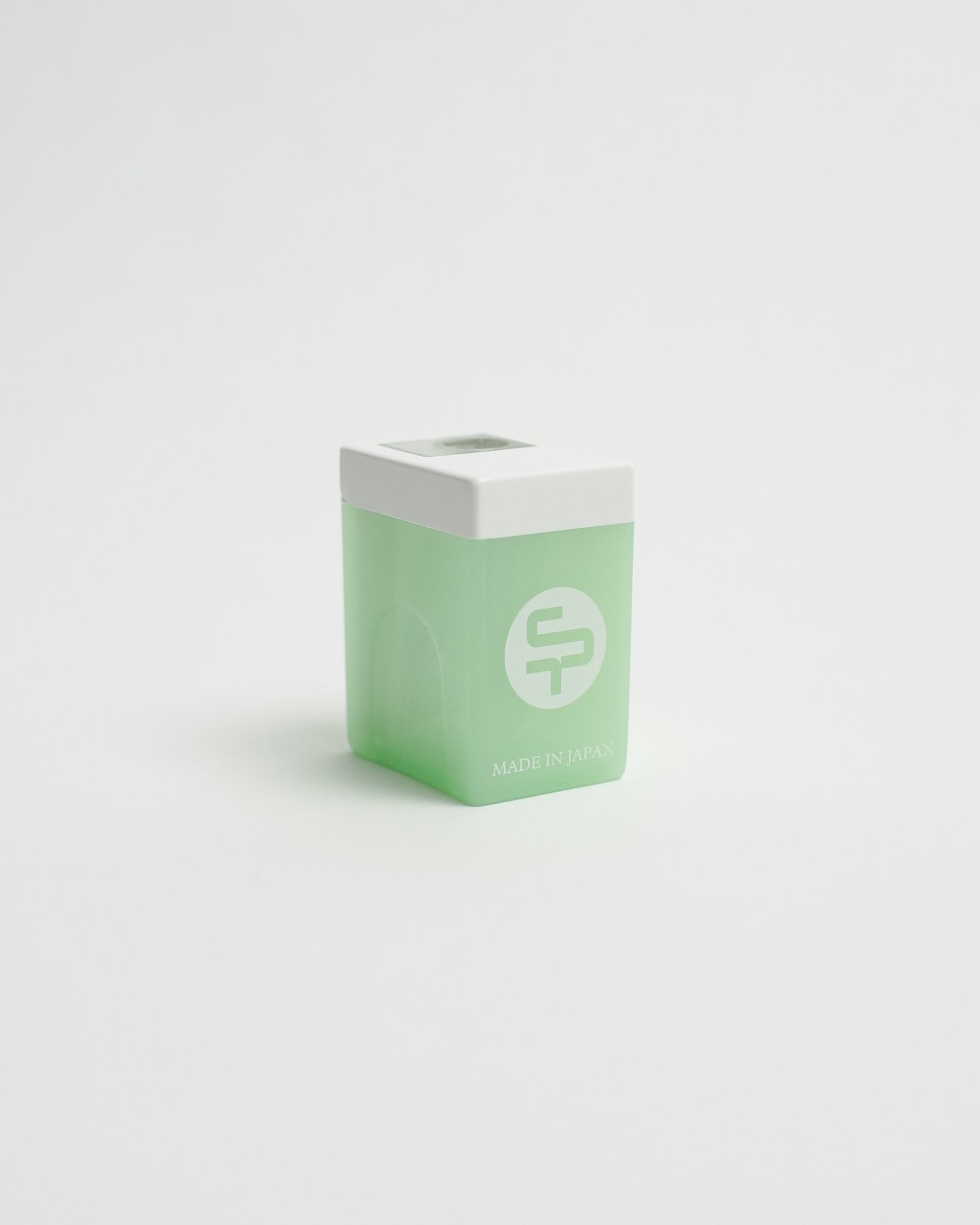 The transparent pale green body and white cap create a composed, refined presence that highlights its understated functional beauty.