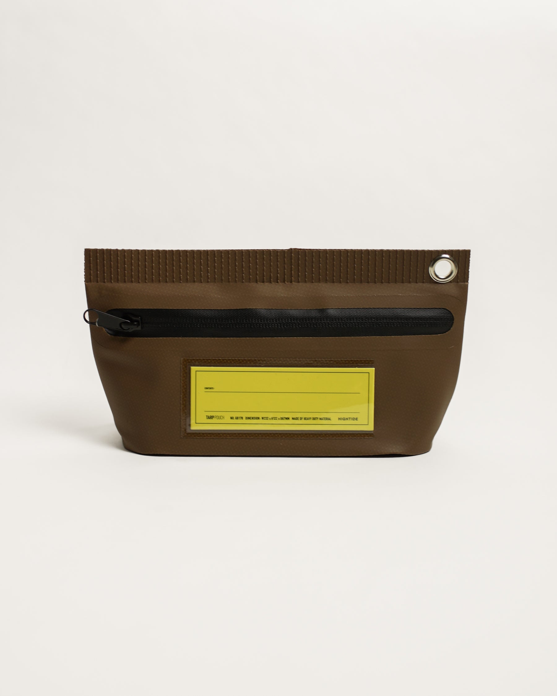 A gusseted water-resistant zippered pouch made of PVC tarpaulin with a label insert by Hightide.