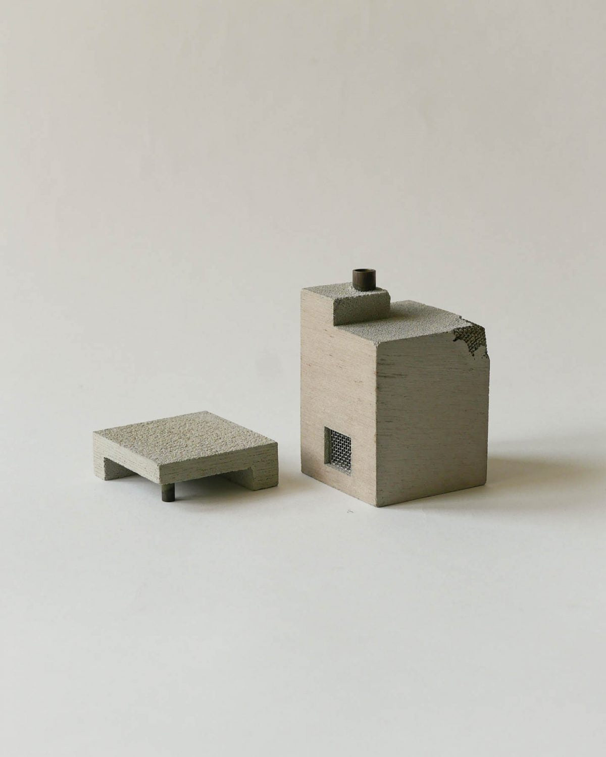 Handmade in Kyoto, Japan and designed by Nobuhiro Sato, the Noloshi Incense Pot reflect the charming details of everyday life. This can be seen in the textural variations in the wood grain used in the forming process, the meticulous window glass and fences, and the incense smoke rising from each tiny chimney.